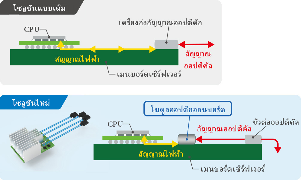 การใช้งาน AI และการเปลี่ยนแปลงทางดิจิทัลที่เพิ่มมากขึ้น ส่งผลให้ความต้องการด้านการสื่อสารด้วยความเร็วสูงและมีประสิทธิภาพสูงของศูนย์ข้อมูลและอุปกรณ์เครือข่ายมีความเพิ่มขึ้นแบบก้าวกระโดด เพื่อตอบสนองความต้องการนี้พร้อมทั้งลดการใช้พลังงานไปพร้อมๆกันเทคโนโลยีที่แทนที่สัญญาณไฟฟ้าแบบเดิมด้วยสัญญาณออปติกจึงได้รับความสนใจเพิ่มมากขึ้น เคียวเซร่าได้ใช้ประโยชน์จากเทคโนโลยีเฉพาะของเราในแผงวงจรและอุปกรณ์ออปติกเพื่อพัฒนาอุปกรณ์ "โมดูลออปติกออนบอร์ด" ใหม่ที่จะแปลงสัญญาณไฟฟ้าเป็นสัญญาณออปติกสำหรับการส่งและรับสัญญาณความเร็วสูง การแปลงสัญญาณไฟฟ้าจากแหล่งต่าง ๆ เช่น CPU ให้เป็นสัญญาณออปติคัลตั้งแต่เริ่มต้นทำให้อุปกรณ์ของ เคียวเซร่าสามารถลดการสูญเสียสายไฟได้อย่างมาก นวัตกรรมนี้ทำให้เกิดความสำเร็จครั้งแรกของโลก นั่นคือแบนด์วิดท์การส่งข้อมูล 512 Gbps ซึ่งสอดคล้องกับมาตรฐาน PCIe® 5.0* ความก้าวหน้าครั้งสำคัญนี้จะช่วยให้ศูนย์ข้อมูลและอุปกรณ์เครือข่ายทำงานได้เร็วขึ้นและประหยัดพลังงานมากขึ้น อีกทั้งยังช่วยปูทางไปสู่โครงสร้างดิจิทัลพื้นฐานที่มีประสิทธิภาพสูงในอนาคต *เป็นผลิตภัณฑ์ที่เข้ากันได้กับมาตรฐานอินเทอร์เฟซขยาย PCI Express Gen 5 (ผลการวิจัยของ Kyocera ในเดือนกันยายน 2022) *PCIe® เป็นเครื่องหมายการค้าจดทะเบียนของ PCI-SIG